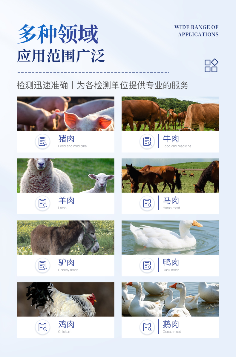 該儀器是一款**、便捷的食品檢測設備,專為識別肉類的真假而設計。可以對豬肉、牛肉、羊肉、馬肉、驢肉、鴨肉、雞肉、鵝肉等各種動物源性進行檢測。能夠迅速、準確地檢測肉類及肉源性種類,確保所食用的肉類真實可靠。檢測迅速準確,為各檢測單位提供專業的服務。