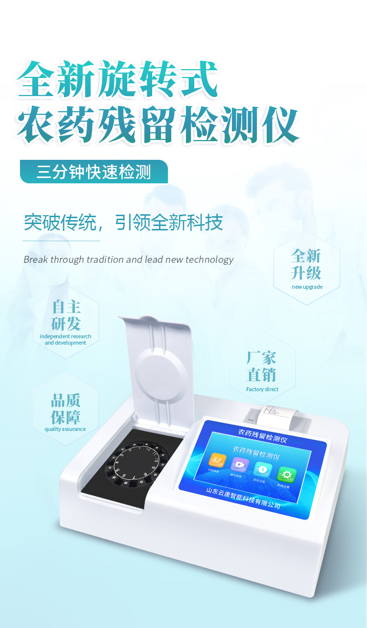 山東云唐智能科技有限公司生產(chǎn)的農(nóng)藥殘留檢測(cè)儀廣泛應(yīng)用于主要用于蔬菜、水果、茶葉、糧食、農(nóng)副產(chǎn)品等食品中農(nóng)藥殘留的快速檢測(cè),依據(jù)國(guó)標(biāo)GB/T5009.199-2003進(jìn)行檢測(cè),適用于果蔬茶生產(chǎn)基地以及農(nóng)貿(mào)批發(fā)銷售市場(chǎng)現(xiàn)場(chǎng)檢測(cè),餐館、學(xué)校、食堂、家庭果蔬加工前的安全速測(cè)等。