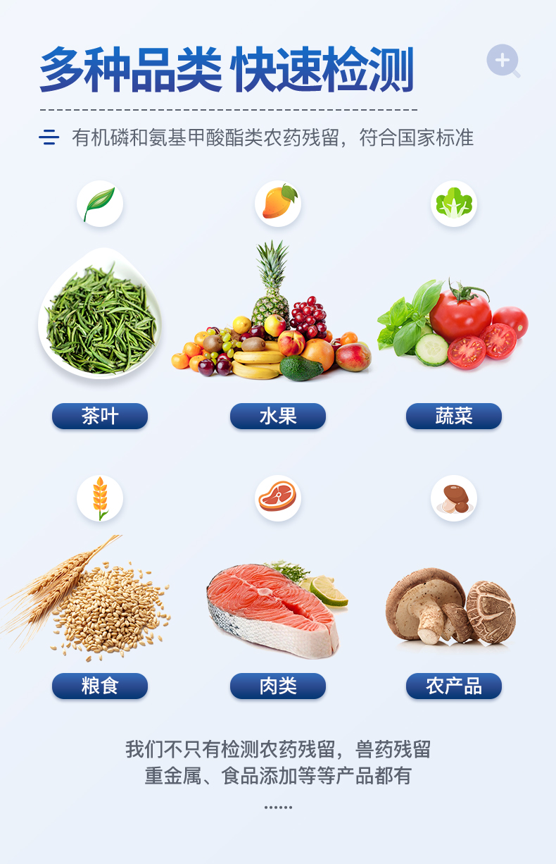 廣泛應(yīng)用于主要用于蔬菜、水果、茶葉、糧食、農(nóng)副產(chǎn)品等食品中有機(jī)磷和氨基甲酸酯類農(nóng)藥殘留的快速檢測;此外還可用于果蔬茶生產(chǎn)基地和農(nóng)貿(mào)批發(fā)銷售市場現(xiàn)場檢測,餐館、學(xué)校、食堂、家庭果蔬加工前的安全速測等。