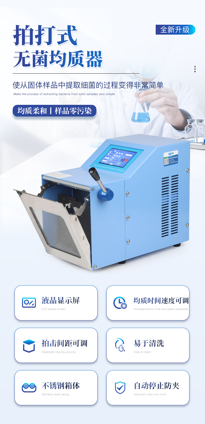 ●5英寸液晶顯示屏。    ●可儲存三組工作程序。    ●可調整的均質時間。    ●均質速度可調節或固定。    ●拍擊器可調整前后距離。    ●無菌一次性濾袋,保證衛生。    ●全開啟式門,易于清洗。    ●玻璃透明窗口易于觀察 。    ●樣品與均質儀無接觸,如無樣品泄露則不需進行系統清洗.    ●均質柔和、樣品零污染、無損傷、不升溫、不需要滅菌處理,不需洗刷器皿。