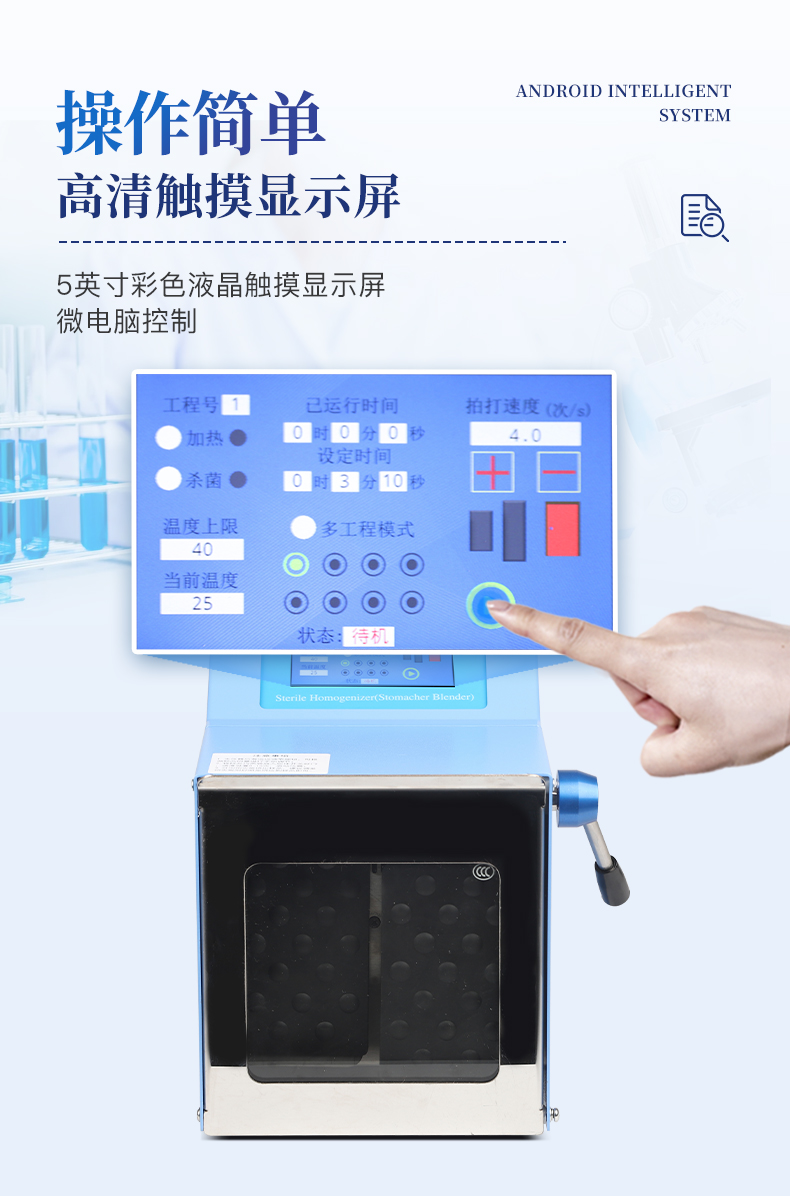 ●5英寸液晶顯示屏。 ●可儲存三組工作程序。 ●可調整的均質時間。 ●均質速度可調節或固定。 ●拍擊器可調整前后距離。 ●無菌一次性濾袋,保證衛生。 ●全開啟式門,易于清洗。 ●玻璃透明窗口易于觀察 。 ●樣品與均質儀無接觸,如無樣品泄露則不需進行系統清洗. ●均質柔和、樣品零污染、無損傷、不升溫、不需要滅菌處理,不需洗刷器皿。