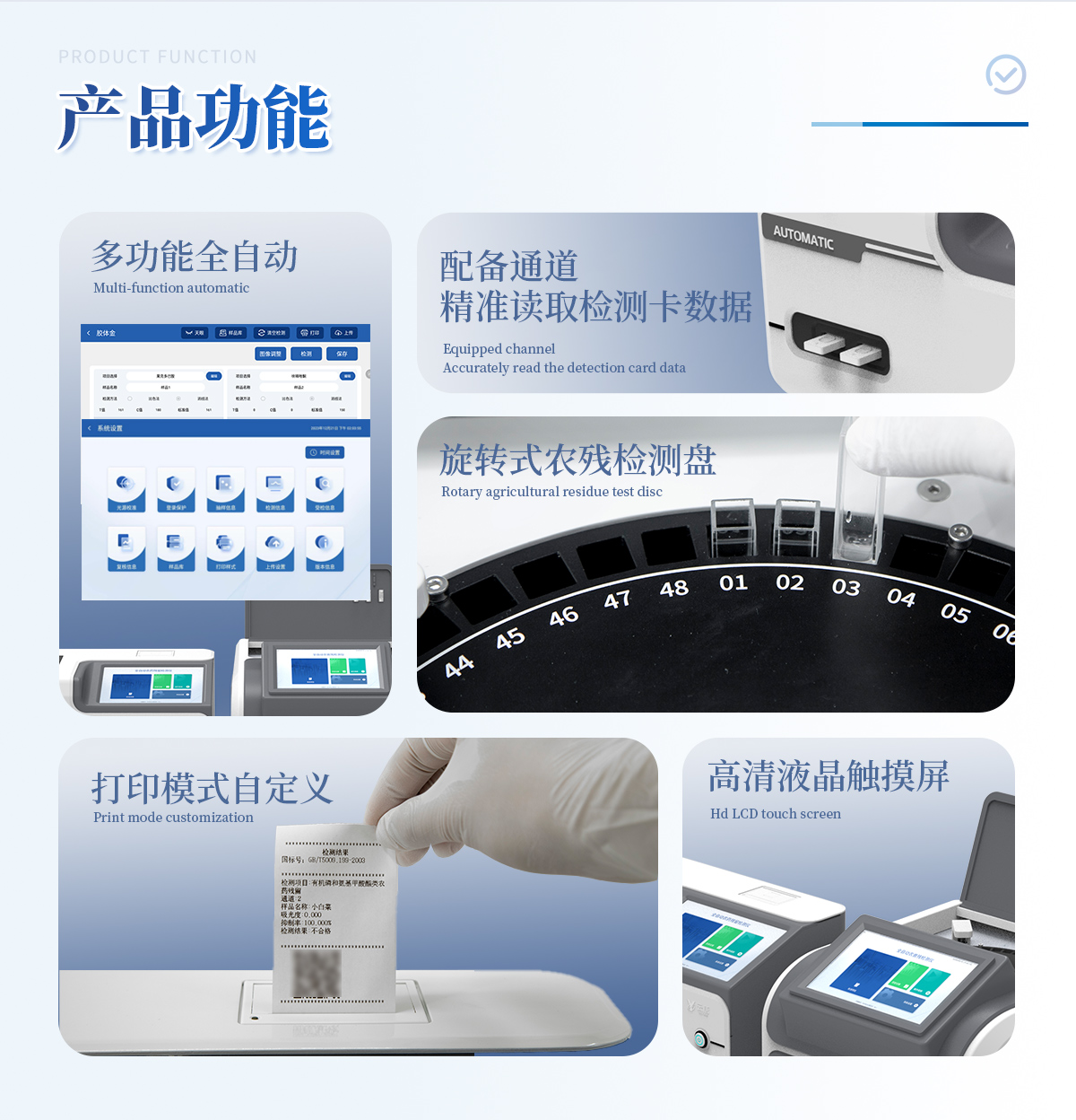 | 1. 試劑位置:3個(gè) | 2. 農(nóng)殘檢測(cè)盤(pán):旋轉(zhuǎn)24通道比色盤(pán),可任意選擇檢測(cè)通道,自動(dòng)對(duì)應(yīng)選擇通道。 | 3. 膠體金通道:2個(gè),可讀取檢測(cè)卡結(jié)果,自動(dòng)采集、處理分析,自動(dòng)判斷檢測(cè)結(jié)果,并具備自動(dòng)判空功能。 | 4.系統(tǒng)配置:10.1寸高清液晶觸摸屏,采用ARM Cortex?-A7,RK3288/4核處理器,運(yùn)行內(nèi)存1GB。Android7.1.1 系統(tǒng)分辨率1280×800。 | 5.恒溫系統(tǒng):具有自動(dòng)加溫溫控系統(tǒng),精準(zhǔn)恒溫37℃,精度±0.1℃。 | 6.添加系統(tǒng):儀器按照試劑要求自動(dòng)、按時(shí)、按量加入試劑,并且自動(dòng)對(duì)未正常放置的樣本或異常的樣本進(jìn)行檢查并提示。 | 7.清洗功能:儀器具備回流及自動(dòng)清洗管路功能,避免試劑污染。 | 8.混勻功能:設(shè)備具備自動(dòng)混勻功能。 | 9.光源校準(zhǔn):設(shè)備可自動(dòng)校準(zhǔn),確保檢測(cè)準(zhǔn)確度。 | 10.實(shí)時(shí)監(jiān)控:儀器測(cè)試過(guò)程中屏幕顯示運(yùn)行狀態(tài),可實(shí)時(shí)查看。 | 11.數(shù)據(jù)存儲(chǔ):內(nèi)部存儲(chǔ)16GB,可存儲(chǔ)500萬(wàn)條數(shù)據(jù)。 | 12.樣品多選功能:設(shè)備具備樣品一鍵多選功能,選擇樣品自動(dòng)匹配檢測(cè)通道。 | 13.項(xiàng)目預(yù)設(shè):可提前設(shè)置單個(gè)及多個(gè)相同或不相同的檢測(cè)任務(wù),可單次或者多次調(diào)取,減少檢測(cè)時(shí)間。 | 14.自定義打印系統(tǒng):內(nèi)置自定義打印系統(tǒng),可按需靈活設(shè)置開(kāi)啟或關(guān)閉:產(chǎn)品合格證(國(guó)家農(nóng)業(yè)部標(biāo)準(zhǔn)),二維碼,抽樣信息、檢測(cè)信息,受檢信息等信息的打印。 | 15.A4版本報(bào)告打印功能:設(shè)備可自動(dòng)生成A4版報(bào)告,A4報(bào)告帶二維碼,可掃描二維碼生成電子版,并可識(shí)別真?zhèn)巍?/td> | 16.傳輸方式:儀器配備無(wú)線(xiàn)通信模塊: 4G(APN)通訊模塊、Wifi模塊,藍(lán)牙傳輸模塊,同時(shí)具有USB接口以及RJ45接口能以多種方式實(shí)現(xiàn)數(shù)據(jù)保存和數(shù)據(jù)傳輸功能,設(shè)備數(shù)據(jù)可以同步上傳至平臺(tái)。 | 17.系統(tǒng)17.數(shù)據(jù)監(jiān)管系統(tǒng):設(shè)備自帶監(jiān)管平臺(tái),并可同步對(duì)接監(jiān)管平臺(tái),數(shù)據(jù)可局域網(wǎng)和互聯(lián)網(wǎng)數(shù)據(jù)上傳,檢測(cè)結(jié)果可直接傳至食品安全監(jiān)管平臺(tái)。達(dá)到食品安全問(wèn)題預(yù)估、預(yù)警。 | 18.系統(tǒng)遠(yuǎn)程更新功能:無(wú)需設(shè)備返廠(chǎng),即可遠(yuǎn)程實(shí)時(shí)升級(jí)全新系統(tǒng),節(jié)省時(shí)間成本及避免運(yùn)輸造成設(shè)備損。 |