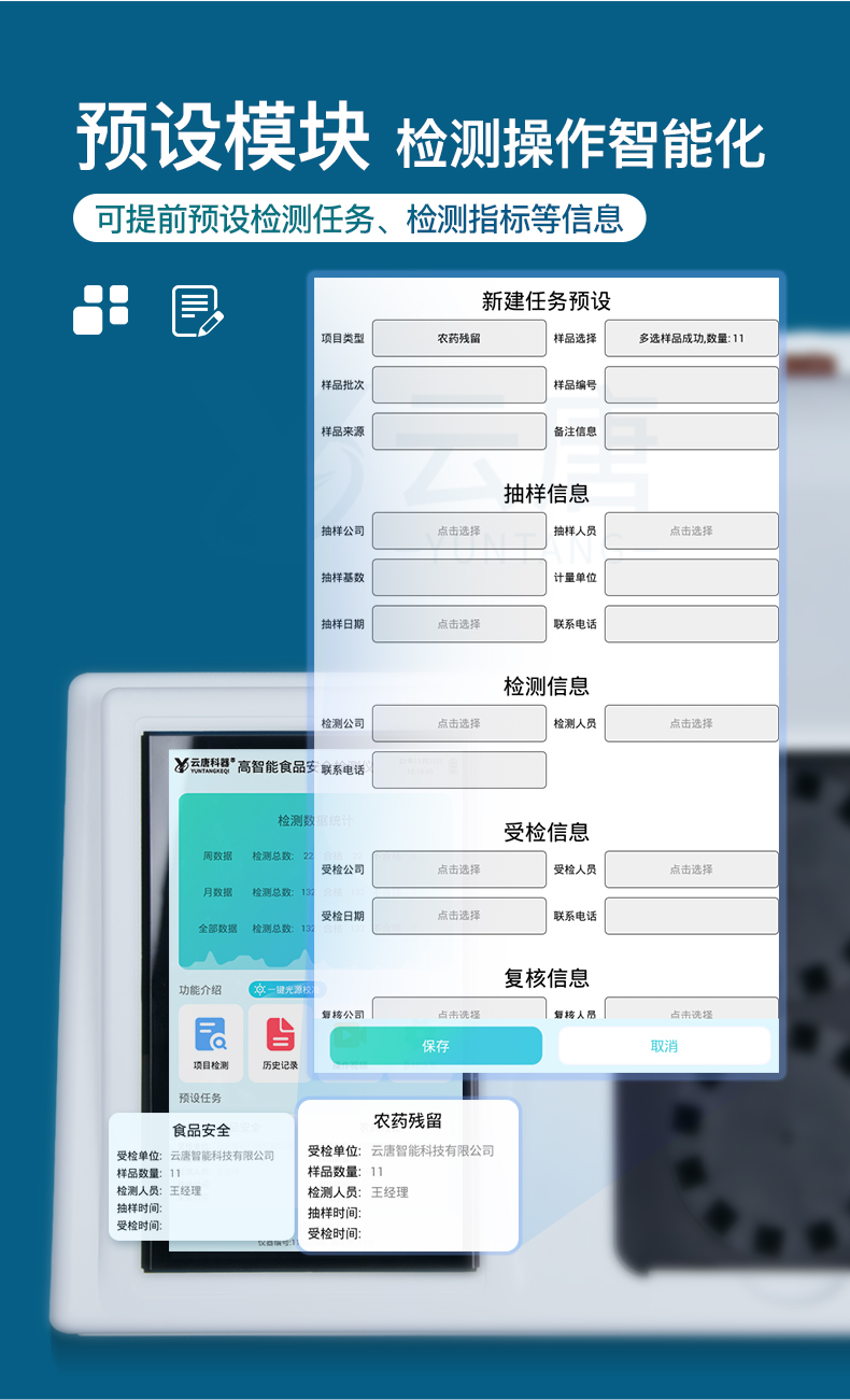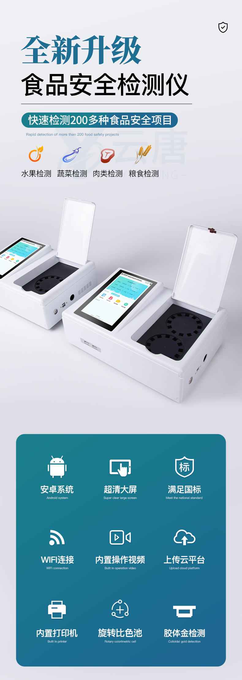 山東云唐智能科技有限公司生產的高智能食品安全檢測儀為集成化食品安全快速檢測分析設備,采用臺式一體化設計,可快速檢測200多種食品安全項目,包含非食用化學物質、濫用食品添加劑、農藥殘留、重金屬、病害肉、營養(yǎng)強化劑等項目的定量檢測。