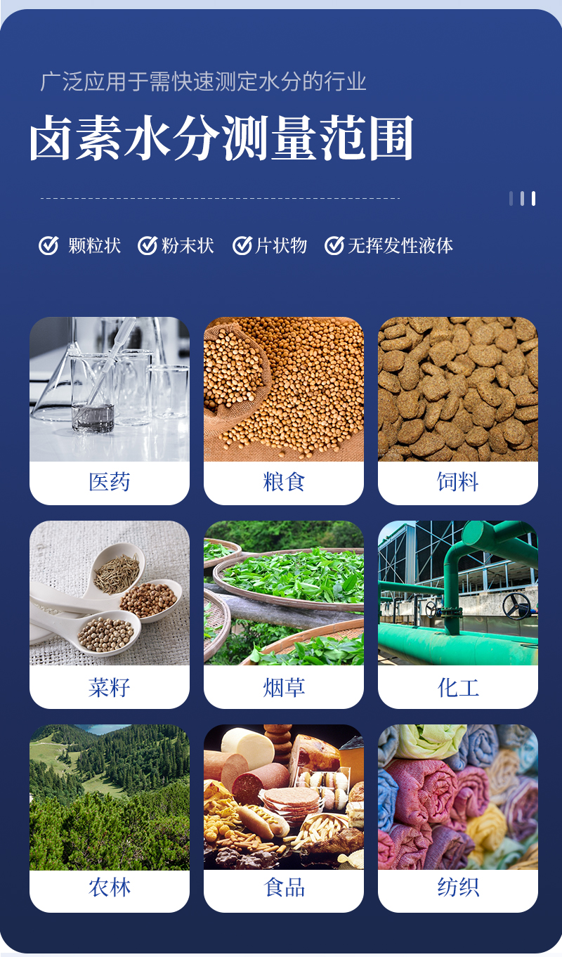 可廣泛應(yīng)用于一切需要快速測(cè)定水分的行業(yè),如醫(yī)藥,糧食、飼料、種子,菜籽,脫水蔬菜、煙草,化工,茶葉,食品、肉類(lèi)以及紡織,農(nóng)林、造紙、橡膠、塑膠、紡織等行業(yè)中的實(shí)驗(yàn)室與生產(chǎn)過(guò)程中。同時(shí)滿(mǎn)足固體、顆粒、粉末、膠狀體及液體含水率的測(cè)定要求