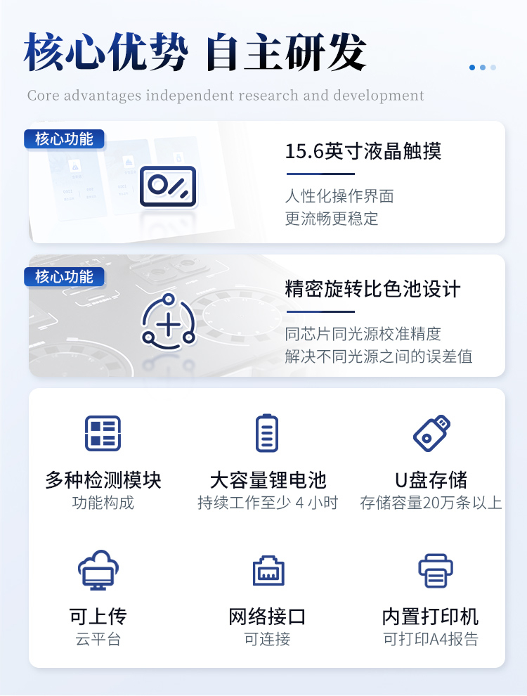 1. 功能構(gòu)成:主要包括分光光度模塊、新型農(nóng)殘檢測模塊、膠體金檢測模塊、熒光檢測模塊、數(shù)字化管理模塊等,所有模塊集成一體,可快速檢測200多種食品安全項(xiàng)目,如獸藥殘留、農(nóng)藥殘留、非法添加劑、細(xì)菌數(shù)值等指標(biāo)。