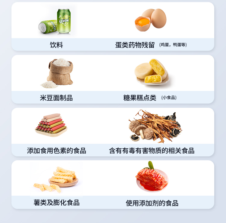 2. 檢測樣品種類:餐具及廚房用品、瓜果蔬菜及其制品、水產(chǎn)品及其制品、畜禽產(chǎn)品及其制品、嬰幼兒乳品及奶粉制品、蜂蜜、糧油及其制品、調(diào)味品(食醋、醬油、味精、鹽等)、酒類茶葉及其制品、食用菌、飲料、蛋類藥物殘留(雞蛋,鴨蛋等)、米豆面制品、糖果糕點(diǎn)類(小食品)、薯類及膨化食品、瓶(桶)裝飲用水、添加食用色素的食品、使用添加劑的食品、含有有毒有害物質(zhì)的相關(guān)食品。