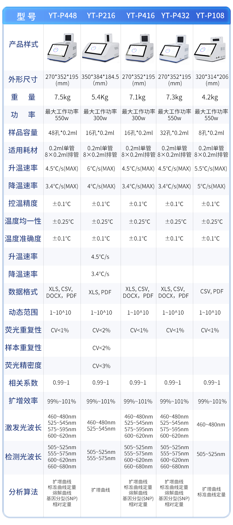 | 基本性能 | 外形尺寸:270*352*195 (mm) | 重量:7.1kg | 電源:220V | 功率:**工作功率300w | 操作系統:自帶Android操作系統 | 外接電腦:外接windows電腦(win7系統以上) | 系統語言:中英文實時切換 | 通信接口:方形USB | 操作環境參數 | 操作環境溫度:18~35℃ | 操作環境相對濕度:0%~85% | 運輸及儲存溫度:-20~55℃ | 運輸及儲存相對濕度:0%~85% | 系統性能 | 樣品容量:16孔*0.2ml | 樣品容積:15~100ul | 適用耗材:0.2ml單管、8×0.2ml排管 | 控溫范圍:4~99℃ | 熱蓋溫度:30℃-108℃(默認105℃,熱蓋溫度可調) | 溫控方式:高性能進口半導體 | 梯度控溫:3模塊梯度控溫,**溫差支持35℃ | 升溫速率:4.5℃/s(MAX) | 降溫速率:3.4℃/s(MAX) | 控溫精度:±0.1℃ | 溫度均一性 :±0.25℃ | 溫度準確度 :±0.1℃ | 操作功能:預設項目和分析參數,操作簡單方便 | 報告:支持報告自定義模塊,16孔分項目打印 | 分析功能:具多重qPCR數據分析功能,可同時檢測4個檢測通道 | 斷電保護:可以一鍵重啟中斷的實驗 | 儀器信息:擁有故障記錄,分析,提示的功能,更方便遠程解決問題 | 分析算法:擴增曲線,標準曲線定量、熔解曲線,基因分型(SNP),相對定量 | 支持HRM檢測:支持 | 數據導出:可將實驗結果以圖形和表格的形式直接導出;詳細的數據報告內容包括實驗條件,數據坐標和表格,數據分析參數。 | 數據格式:XLS, CSV, DOCX,PDF | TouchDown功能:支持時間和溫度遞增遞減模式 | 熒光檢測系統性能 | 檢測靈敏度:可檢測單拷貝基因 | 動態范圍:1~10^10 | 熒光重復性: CV<1%(使用某品牌試劑做16孔均一性實驗,16個孔的Ct差值保持在0.5以內,CV保持在1%以內。) | 相關系數:0.99~1(每種濃度3個重復,梯度曲線的相關系數>0.99,擴增效率保持在99%~101%之間) | 擴增效率:99%~101% | 可信度:區分1000與2000拷貝濃度差異 | 激光光源:大功率LED(免維護,壽命長) | 檢測器:高靈敏度光電傳感器 | 激發和檢測傳播介質:耐高溫專業導光光纖 | 激發光波長: 460nm~480nm , 525nm~545nm, 575nm~595nm ,600nm~620nm | 檢測光波長: 505nm~525nm , 555nm~575nm , 600nm~620nm , 660nm~680nm |